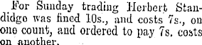 For Sunday trading Herbert Standidgo was fined 10s., and costs 75., on ono count, and ordered to pay 7s. costs on «nother.