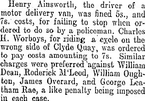 Henry Ainswortb, the driver of a motor delivery van, was fined 55., and 75." costs, for failing to stop when ordered to do so by a policeman. Charles H. Worboys, for riding a.'cycle on the wrong side of Clyde Quay, was ordered to pay oosts amounting to 7s. Similar charges were preferred 'against William Dean, Roderick M'Leod, William Oughton, James Overard, and George Leafcham Rae, a like penalty being imposed in each case.