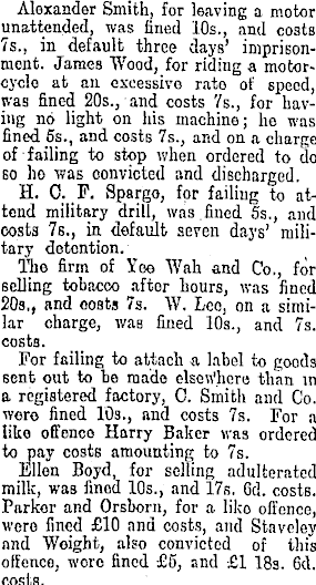 Alexander Smith, for leaving a motor unattended, was fined 10s., and costs 75., in default three days' imprisonment. James Wood, for riding a motorcyclo at an excessive rato of speed, was fined 205., and costs 75., for having no light on his machine; he was fined 55., and costs 75., and on a charge of failing to stop when ordered to do bo ho was oonvicted and discharged. H. O. F. Spargo, for failing to attend military drill, was .fined 55., and costs 75., in default seven days' military detention. The firm of Yeo Wah and Co., for selling tobacco aftor hours, was fined 205,, and oosts 7s. W. Leo, on a similar charge, was fined 10s., and 7s. costs. For failing to attach a label to goods sent out to be made elsetfhcre than in a registered factory, C. Smith and Co. wero fined 10s., and costs 7s. For a iiko offenco Harry Baker was ordered to pay costs amounting to 7s. Ellon Boyd, for selling adulterated milk, was fined 10s., and 17s. 6d. costß. Parkor and Orsborn, for a liko offence, wero fined £10 and costs, and Stnveley and Weight, also convicted of this offence, woro fined £0, and £1 18s. 6d. costs.