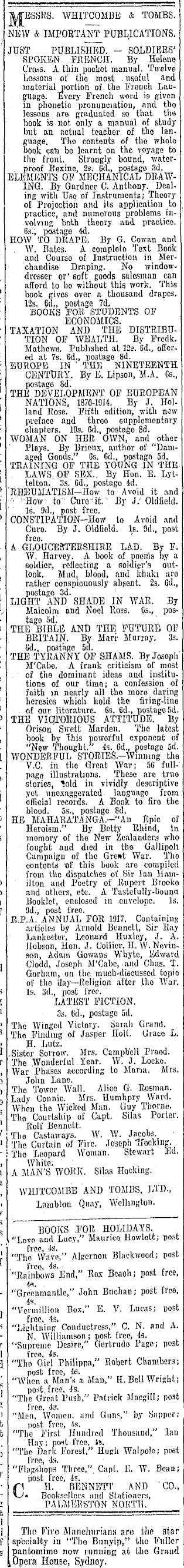 ' .1 _ ' 1. 1 —— < 7\ypSSR-S. WHITCOSIBE & TOMBS, j NEW & IMPORTANT PUBLICATIONS. ; ' JUST PUBLISHED. - SOLDIERS' , SPOKEN FRENCH. By Helene ' Cross. A thin pookot manual. Twelve . Lessons of the most . usoful and . material portion of. the French Lan- ' giiage. Every French word is given in phonetic pronunciation, and the lessons are graduated so that tho hook is not only a manual of stnily , but an actual teacher of the language. Tho contents of tho wholo book can bo learnt on the voyage to : the front. Strongly bound, water- ] . proof Rexine, 2s. 6d., postage 3d. ( ELEMENTS OF MECHANICAL DRAW- ; ING. By Gardner C. Anthony. DeaL 1 ing with Use of Instruments; Theory f of Projection and its application to : practice, and numerous problems involving both theory and practice. 1 r (is.; postage 4d. • HOW TO Hit APE. By G. Cowan and j W. Bates. A complete Toxt Book and Course of Instruction in Merchandise Draping. No windowdresser or' soft goods salesman can r afford to be without this work. This ? book gives ovor a thousand drapes, f 12s. 6d., postage 7d. 1 BOOKS FOK STUDENTS OF J ECONOMICS. TAXATION AND THE DISTRIBUTION OF WEALTH. By Frcdk. Mathews. Published at 12s. Gd., offered at 7s. 6d., postage Bd. t EUROPE IN ' THE NINETEENTH t CENTURY. By E. Lipson, M.A. Gs„ f postage Bd. J THE DEVELOPMENT OF EUROPEAN NATIONS, 1870-1014. By J. Hol--1 land Rose. Fifth edition; with new ? preface and three supplementary t chapters. 10s. Gd., postage Bd. '• WOMAN ON HER OWN, and other 0 ' Plays. By Brieux, author of "Damaged Goods." Gs. Gd., postage sd. r TRAINING OF THE YOUNG IN THE ® LAWS, OF SEX.. By Hon. E. Lyttelton, 3s. Gd., postago 4d. ° RHEUMATISM—How to Avoid it and f ' '"How to" Cure "it." By J:' Oldfield. :l ' Is. 9d., post free. 8 CONSTIPATION—How to Avoid and Curo. By J. Oldfield. Is. 9d., post free. - A GLOUCESTERSHIRE LAD. By F. 5 W. Harvey. A book of noems by a soldier, reflecting a soldier's out- „ look. Mud, blood, and khaki are rather conspicuously absont. 2s. Gd., j postago 3d. LIGHT AND SHADE IN WAR. By v Malcolm and Noel Ross. Gs., poss THE" BIBLE AND THE FUTURE OF BRITAIN. By Marr Murray. 3s. r (id., postage Da. r THE TYRANNY OF SHAMS. By Joseph' J M'Cabo. A frank criticism of most , of tho dominant ideas and institutions of our timo; a confession of faith in nearly all tho more daring 1 heresies which hold the firing-line B .of our literature. Gs. Gd., postage sd. 0 THE VICTORIOUS ATTITUDE. By Orison Swett Marden. Tho latest i, book by "this powerful exponent of "New Thought." Is. Gd., postage sd. \ WONDERFUL STORIES.-Winmng the V.C. in the Great War; 56 full-' B page illustrations. These are true stories, lold in vividly descriptive j yet unexoggcratod. language from official records. A Book to fire the blood. 55., postage Bd. t HE MAHARATANGA.—"An Epic of V Heroism." By Betty Rhind, In s memory of the New Zealanders who fought aud died in tho Gallipoll Campaign of the Great War. The contents xif this book are compiled from tho dispatches of Sir lau Ham--0 ilton and Poetry of Rupert Brooke 0 and others, etc. A Tastefully-tjouna 11 Booklet, enclosed in onvelope. Is. f 9d., post freo. B.P.A. ANNUAL FOR 1917. Containing articles by Arnold Bennett, Sir Ray Lankester, Leonard Huxley, J. A. llobson, Hon. J. Collier, H. W. Nevinson, Adam Gowans Whyte, Edward 1 Clodd, Joseph M'Cabe, and C'has. T. Gorham, on the much-discussed topic of tho day—Religion after the War, s is. 3d., post free. K LATEST FICTION. n 3s. (id., postage sd. '' The Winged Victory. Sarah Grand. s Tho Finding of Jasper Holt. Grace L. '< H. Lutz. d .Sistor Sorrow. Mrs. Campbell Praed. i' The Wonderful Year. W. J. Locke. j, War Phases according to Maria. Mrs. 0 John Lane. 0 The Tower Wall. Alico G. Rosman. ■ B Lady Connie. Mrs. Humhpry Ward. „ When the Wicked Man. Guy Thorne, ~ Tho Courtship of Capt. Silas Porter. Rolf Bennett. ? 1 The Castaways. W. W. Jacobs. " I The Curtain of Fire. Joseph lidckiiig. !-; Tho Leopard Woman. Stewart Ed. I, White; ' a A MAN'S WORK. Silas Hocking. 1 WHITCOMBE AND TOMBS, LTD., r, i Lambton Quay, Wellington. y ' BOOKS .FOR HOLIDAYS. I "Love and Lucy," Maurice Howlott; post f "The G Wave," Algernon Blackwood; post freo, 4s. ■ "Rainbows End," Rox Bcaoli; post free, 46. "Grflonmantlc,''' John Buchau; post frc©, 4s. . "Vermillion Box," E. V. Lucas; post free, 4s. :s "Lightning Conductress, C. N. and A. 1- N. Williamson; post, free, 4s. r "Supreme Desire," Gertrudo Page; post il free, 49. d "Tho Girl Philippa," Robert Chambers; , post free, ,' "When a Man's a Man," H. Bell Wright; . post, free, 4s. " "The Great Push," Patrick Macgill; post J 5 freo, is. " "Men, Women, and Guns," by Sapper; it post free, 4s. 'fc "Tho First Hundred Thousand," lan 1. Hay; poit free, 4s. n "Tlio Dark Forest," Hugh Walpole; post free, 4s. " "Flagshops Three," Capt. E. W. Bean; •' post free, 4s. '• f\ H. BENNETT AND CO., I" Booksellers and Stationers, K PAUJERSTON NORTH, it ——--=■ ■■ . — d i| Tho Five llanchuriana are the star >f specialty in "Tho Bunyip," the Fuller is pantomime now running at tho Grand House, Sydney.