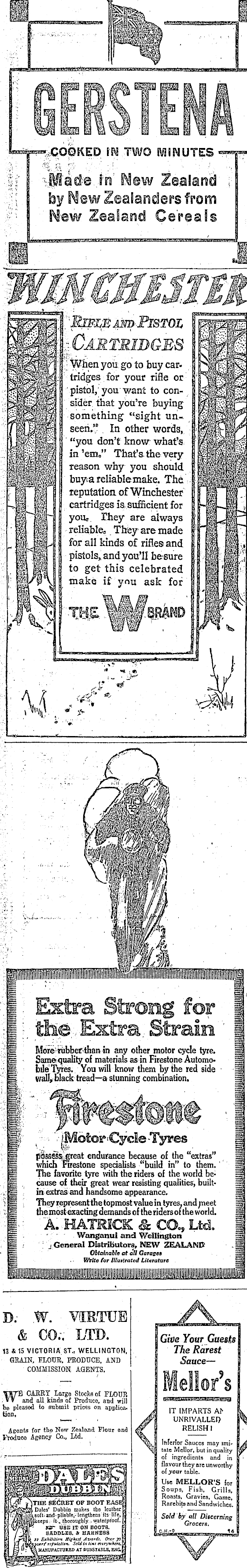 «*_» COOKED \N TWO RfI!MUTES «™=p- : 'Made in New Zealand' ; by New leaSanelers from Hew Zealand Cereals R r EiFLBAmPiSTOI pip|F -(Dai? 7Ti j? q HILJIr Pm/ykj. When you go to buy car. jmJ*l§ *s! tridges for your rifle or wlr pistol, you want to con- 0^ sider that you're buying /M*m^ something- «sight un- MjSjf*j seen." In other words,, fflffl^ "you don't know what's ' '^MMW^ in'em," That's, theory ftriSfaU reason why you should tl«M!'^ buy.a reliable make. The ISSpfi reputation of Winchester w- m cartridges is sufficient for ■ ""If— -H ■* Byous They are always ' ft^l!"" 1 reliable e They are made ' "f| ||"v for all kinds of rifles and : jjl, p >;» pistols, and you'll be-sure || f to get this celebrated '?$' 'm'h make if you ask for ' H >V *-> - ■ • l ■ ° ♦ '■'.'' ' .. . j: H in any other motor cycle tyre. =i ■'■ M Same;quality of materials as in Firestone Automo =a ; H bile lyres. You will know them by the red side §| ';/H . wall, black tread—a stunning combination. =3 ; "|| p'ossessbgreat endurance because of the "extras" j| 55 which Firestone specialists "build in" to them.' j| ~ The favorite tyre with the riders of the world be- = .H , cause of their great wear resisting qualities, built- §1 ,: H . in extras and handsome appearance. §f "i H -,' Theyrepresentthetopmdstvalueintyres,andmeet l§ r:,M thembstexacting demands of the riders of the world. §j •' I' A. HATRSCK & COo, Ltd. i" , == ■ y Wanganui and Wellington = ■"| > j General Distributors, NEW ZEALAND - = ■ = Obtainable at all Caracas S = .. Write for Illustrated Literature S tiiii^ D. .W. VIRTUE & CO.. LTD. Give Your Guests 13&15 victoria ST., Wellington, The Rarest GRAIN, ILOUR. HBODTICE. AND ' Sauce— COMMISSION AGENTS. „,„ a • - ' . Mellor s \STB CABRT Large Stocks of FLOUR ■_ ;■»» and all kinds of Produce, and will iwmiun«gMi»»TO bo pleased to submit prices on applica. J A^ tiOn ' .— ■ jd UNRIVALLEP Agents for the New Zealand Flour and w' RELISH 1 IVodtioo Agency Co., Ltd. , , ! mlenor oauces may imi- >State tate Mellor, but in quality W' '" ' ~ of ingredients and in ; flavour they are unworthy of your table. '^^^^t^U3MJm l - Sou P s - Fish - Grills. Roasts, Gravies, Game |(-yf BE(iRET OF BOOT EASES Rarebits and Sandwiches'. i Dales' Dubbin makes tho leather L ' '• ; Bofti P'teWe.- lefiglhens «s life, H'' ;■ Sold by all Discerning • r/MHej l: «P s ' l '« l k9? o ' i ehly.'waterproof. 1, j Grocers ■ KB" nSB IT ON BOOTS. g «i-t.i«. jjml SADDLES, A HABHEBS f umi^iuijjwmi ' ©