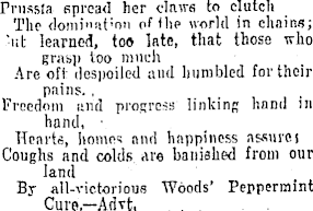 Prussia spread her claws to clutch The clomi"nt'on of flip world in chains; ■lit learned, toe late, that those who grasp too much Are oft despoiled and humbled for their pains. , Freedom mid progress linking hand in hand, ■ Hearts, home's and happiness assuroi Coughs and colds are banished from our land Bj all-victorious Woods' Peppermint Cure— Advt, ... . .