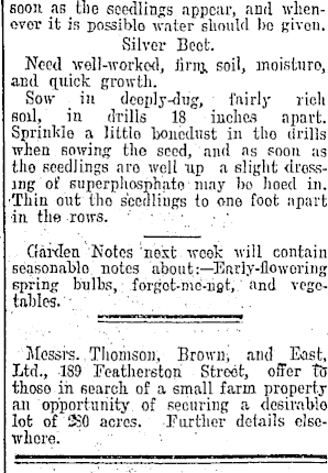 soon as the seedlings appear, and when-' ovor it is possible water should bo givou. Silver Beet. Need well-worked, Jirm, soil, inoisturo, and quick growth. Son- in deonly-dug, fairly rich soil, in drills 18 inches apart. Sprinkle a littlo bonedust in tho drills when sowing the seed, and as soon as tho seedlings aro well up a slight dressing of superphosphate may bo hoed in. ■Thin out tho seedlings to one foot apart in the rows. ' ■ • ■ • Garden Notes 'next week will contain ' seasonable, notes about:—Enrly-floworing spring bulbs, forgot-mti-nst,: and vegetables.-. Messrs. Thomson, Brownj and East, Ltd., -189 Featheretori Street, offer tS those in search of a small farm property an opportunity, of securing a desirable lot of 230 acres. Farther details elsewhere.