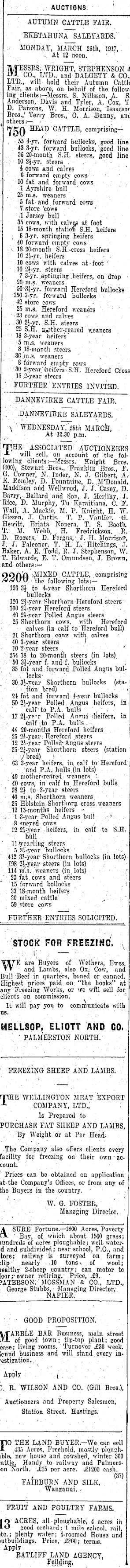 .- AUCTIONS. ' ( ■ AUTUMN CATTLE FAIR. EKETAHUNA SALEYARDS. i . ■ MONDAY, MARCH 26th, 1917, ! -. At 12 noon. ■ Tlf ESSRS. WRIGHT, STEPHENSON 4 ■ IWL CO., LTD.. and DALGETY & CO., LTD., irill hold their Autumn Cattle Fair, as above, on behalf of the following clients:—Messrs. S. Nillsson, A. S. Anderson, Davis and Tyler, A. Cox, T. D. Parsons, W. H. Morrison, Isaacson Bros.,' Terry Bros., 0, A. Bunny, and others:— / 750 CATTLE, comprising— : , 55 4-yr. forward bullocks, good line : 43 3-yr. forward bullocks, good lino 36 20-month S.H. steers, good lino : ■ 10 2J-yr. steers . : 4 cows and calves 6 forward empty cows ; 10 fat and forward cows 1 Ayrshire bull , 25 m.s. weaners , 5 fat and. forward cows ; 7 store 'cows i ;1. Jersey bull - 35 cows, with at foot 15 18-month S.H. heifers ; 6 3-yr. springing heifers 40 forward empty cows 1 ■. 18-20-month S.H.-cross heifers 10 2J-yr. heifers 10 cows with calves at-foot' 10 2J-yr. steers 7.3-yr.'.springing'.heifers, on drop ■ 20, m.s. weaners ■ • 50-35-yr. forward Hereford bullocks 150 3-yr. forward bullocks 42 store cows 25 m.s. Hereford weaners ; ' ■ 23 cow? and calves ... 30 2J-yr. S.H. steers 25 S.H,. aether-reared iveaners 18 3-yeai 1 heifers" 5 m.s. weaners • 8.18-month steers , . 36 ,m .5. weaners ~ 8-forward empty cows .10 2-year 'heifers . S.H. Hereford Cross , 15.2-year steers FURTHER ENTRIES INVITED. DANNEVIRKE CATTLE FAIR. . DANNEVIRKE SALEYARDS. •\ WEDNESDAY, 28th Mi.RCH, At 12.30 p.m. r F,HE ASSOCIATED AUCTIONEERS will sell, on account of tho following clients:—Messrs. Knight Bros. (400), Stewfirt Bros., Franklin Bros., F. G. Cowper, N. Inder, N. J. Gilbert, A. E. Roinley, D. Fouhtaiiie, D. .M/Donald, iladdison and Wellwood, J. J.'Casey, D. Barry, Ballard and Son, J, Herlihy, J. 'Rice, D. Murphy, Tu Karaitiana, O. i'. Wall, A. Mackie, M P.' Knight, H. W. Giesen, .T. Curtis. T. P. Vautier. •<•}. Hewitt, Eriata Nopera. T. S. Bootlv T. .M. Welib, :H. Fredrickson. R, D. Rosers, D. Fergus,- J. TT. Morrisoi\ •T. J. Falconer, T. H.' L. : 'Hitcliings, .T. Baker, A. E. Todd, R. J. Stephenson, W. T. Edwards, E. T. Omundsen, J. Brown, and others:— , OOAA ;MIXED CATTLE, comprising /Vi4l\}X),, 'thp following lots 120 3J to 4-year Shorthorn Hereford bullocks 120 25-year Shorthorn-Hereford steers 100 2'-year Hereford'steers 40 21-year Polled Angus steers ,25 Shorthorn cows, with Hereford calves (in calf to Hereford bull) . 2t Shorthorn. cows with calves 40 3-year steers - / .. 10 2-year steers , .' ' 254 18 to 20-month steers (in lots). . 50 3J-year f. and-f. bullocks 35 fat and forward Polled Angus bul- „ locks . 30.3V-year Shorthorn bullocks (station bred) . . . . • , 24 fat and forward 4-year bullocks 50 Polled Angus heifers, in calf to P.A. bulls 17 Polled An"us theifers, in ■ calf to P.A. bulls . - 44 20-montlis Hereford heifers ,25 25-year; Hereford .steers 12 21-year Polleih Angus steers 25-2£-yenr Shorthorn steers (station . / bred) i 63, 3-year heifers, in. calf to Hereford' /and P.A. .bulls'.(in lots) 40 mother-reared weaners : 40 cows, in calf to. Hereford bulls 98 21 to 3-year steers .- '. '40 nus. Shorthorn weaners. 25 ,Hblstoin Shorthorij cross.weaners 12 15-months heifers -■ .' 1 3-year. Polled Angus bull • . R sneyed cows 12 2S-vear heifers, in calf to S.H. ' . 'bull '- 11 pearling steers . , 5 .ii-y'enr bullocks ■' 412 Si-year Shorthorn bullocks (in lots). ,108 2J-year steers (in lots) 114 m'.s. weaners (in lots) 1 .''. ' 23 fat. cows and steers '15 forward bollocks i . '$3'lß-month heifers ' . , 30 mixed cattle' : . 59, store cows FURTHER ENTRIES SOLICITED. STOCk FOR FREEZIMcf, , WE are Buyers of Wethers, Ewes, and Lambs,, 'also Ox, Cow, and Bull Beef ,in quarters, boned or canned. Highest prices paid on. "the hooks" at any Freezing Works, or we'will sell for clients on commission.' It will pay yon to communicate with us. MELLBOP, ELIOTT AND CO. ' PALMERSTON NORTH. FREEZING SHEEP AND LA JIBS. ' mHE WELLINGTON MEAT EXPORT X COMPANY, LTD., Is Prepared to PURCHASE FAT SHEEP AND LAMBS, By Weight or at Per Head; The Company also offers clients every facility for freezing oil their own • ac- . count. f Prices - can bo obtained on application: at-the Company's Offices, or from any of the Buyers in the country. W. G. FOSTER,. Managing Director.. ' •; ■' ' ' - i A SURE Fortune.—l 800 Acres, Poverty i 'Bay, of which about 1500 grass; i hundreds of acre« ploughuble; well watered and subdivided; near school, P. 0., and store,•; railway is surveyed on. farm; ' clip nearly 10 tons v. of wool; healthy 2-sheep country; can motor to 1 Joor," owner retiring. Price, ' : PATERSON,' MOSSMAN & CO., LTD., j George Stubbs, -Managing Director, NAPIER. I i - GOOD PROPOSITION. j MARBLE BAR Business, main street ! of good town; tip-top plant; good ; lease; living rooms. ' Turnover .£3O week. ! 3eund business and will stand , every in- ' vestigation. Apply , '. C. R. WILSON AND CO. (Gill Bros.), Auctioneers and Property Salesmen, Station Street. Hastings. TO THE LAND BUYER,-We can sell 435 Acres, Freehold, mostly plauzhable, new house and cowshed, winter 300 cattle. Handy to railway and Palmerston North. JBIS per acre. JBJ2OO cash. (37) FAIRBUKN AND SILK, . Wangonui. . FRUIT AND POULTRY FARMS. ■jo ACRES, all plough able, 4 .acres in XO good orchard; 1 mile school, rail, etc.; plenty water; 4-roomed House and outbuildings. Price, ,£800; terms. Apiily RATLIFP LAND AGENCY, Fsilding,