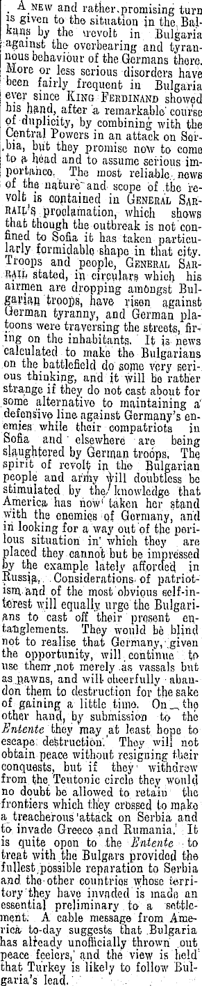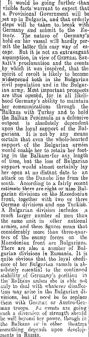 In would be going further -than visible facts'warrant to expect,- that' a. Brovisional Government will be ,set up in Bulgaria, and that orderly steps' will be taken to,< break with Germany and submit to the .Entente. . 'The nature of Germany's, hold on her vassal will hardly permit the latter this easy way of escape. But it is not an oxtravagant assumption, in view of General SAe* rail's proclamation and the ovents v by which it was inspired, that the spirit of revolt is likely to become widespread both in the Bulgarian civil population and in the Bulgarian army. Mcfst important prospects are thus opened, for in all likelihood Germany's ability to maintain her Communications through . the Balkans with Turkey and to hold the Balkan Peninsula as a defensive outposfc is absolutely dependent upon the loyal support of the Bulgarians. It is not by any means certain that even the whole-hearted support ■ of. the Bulgarian armies would enable her to retain her footing in the Balkans-for any, length of time, but the loss 6"f Bulgarian support would alniost certainly lay her open at no distant date, to an attacE on the Danube line from the south. According'to a fairly recent estimate there are eight or nine Bulgarian divisions on tho Macedonian Front, together with two or three German divisions and ono Turkish.' A Bulgarian division includes .a much larger number of men than the' same unit in other national armies, and these- figures mean that considerably more fhan three-quar-ters of the enemy forces on the Macedonian front are Bulgarians. There are also a number of Bulgarian divisions in Rumania. It is quite obvious that the loyal ohedicnee of her Bulgg.rits.rt vassals is absolutely essential to the continued atubilioy.of Germany's position in the' Balkan:! .unless she is able not only to deal with whatever disaffection may arise in lh<> Bulgarian divisions, but if need be to replace them with Gerinar. or Austrc-Gev-man troops. /<i wveiits are going: such a diversion of strength should be we!! bovond her power, though ir. the Balkans , jar.in other theatres I something depends upon develop-! moiits in Russia.