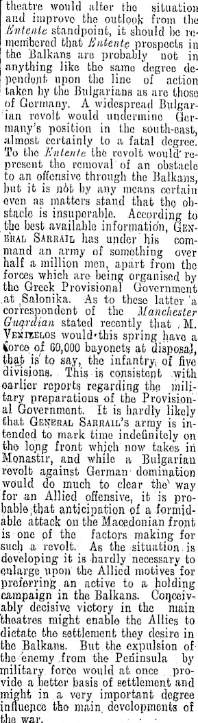 theatre would alter the situation and improve, the outlook from the Entente standpoint, it should be remembered that Entente, prospects in the Balkans are probably not in anything like tho same degreo dependynt upon the line of action taken by the Bulgarians as are those of Germany. A widespread Bulgarian revolt would undermine Germany's position in the south-east, almost certainly to a fatal degree. To the Entente th 6 revolt would'represent the removal of an obstacle to an offensive through the Balkans, but it is not by any means certain oven as matters stand that the obstacle is insuperable. According to the best available information, (J.ejje'kal Sarrail has under his command an army of something over half a million men, apart from the forces which are being organised by tho Greek Provisional Government .at r Salonika. As to these latter a correspondent of the Manchester Guqnlian stated recently that ,M. Vexitelos would-this spring have a force of 60,000 bayonets at disposal, that is' to say, the infantry of five divisions, This is consistent with earlier reports regarding the military preparations of the Provisional Government. It is hardly likely that General army is intendod to mark time indefinitely on tho long front which now takes in Monastir, and while a Bulgarian revolt against German- domination would do much to clear the s way for an Allied offensive, it is probable ; that anticipation of a formidable attack on the Macedonian front is one of the factors making for such a revolt. As the situation, is doveloping it is hardly necessary to enlarge upon the Allied motives for preferring an active to a holding campaign in the Balkans. Conceivably decisive victory in the main 'theatres might enable the Allies to dictate the settlement they desiro in the Balkans. But the expulsion of the enemy .from the Peninsula by military force would at once provide a bettor basis of settlement and might in a very; important degree influence tho main, developments of the war. • •
