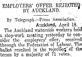EMPLOYERS' OFFER. REJECTED BY AUCKLAND. _ By Telegraph—Press -Association. Auckland, April 18. The Auckland waterside workers held a stop-work meeting yesterday to consider the employers' offer, received through the Federation of labour. The 'ballot resulted in the rejection of the terms by a majority of 71 votes..