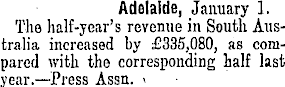 Adelaide, January 1. The half-year's revenue in South Australia increased by £335,080, as compared with the corresponding half last year.—Press Assn. <