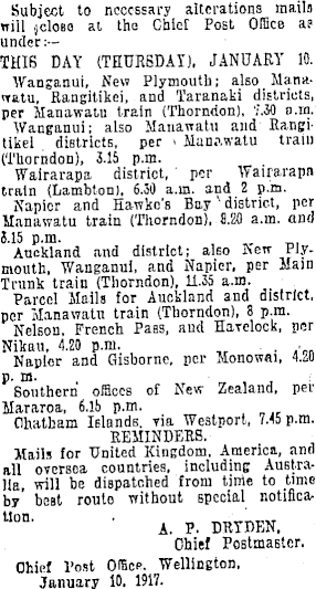 Subject to necessary alterations mails will jcloßO al tho Chiet Post Office a? under:--THIS DAY (THURSDAY), JANUARY 10. Wanganui, New Plymouth; also Mann<ratu, Rangitikei, and Taranaki districts, per Manawatu train (Thorndon), ':.3O o.in.. Wanganui; also Mananatu and £aneitikel dißtricts, per » Man.i.watu train (Thorndon), 3.15 p.m. Walrarapa district, ' per Wairarapn train (Lambton), 6.30 a.m. and 2 p.in. Napier and Eawkc's Bay ' district, per Manawatu train (Thorndon), 8.20 a.m. and 8.15 p.m. Auckland and district; also Ken- Plymouth, Wanganui, and Napier, per Main Trunk train (Tliomdon), 11.35 a.m. Parcel Mails for Auckland and district, per Manawatu train (Thorndon), 8 p.m. Nelson. French Paas, aud HaTelock, per Nikau, 4.20 p.m. . . Napier and Gisborne, per Monowai, 4.20 p. in. : Southern offices of New Zealand, per Mararoa, 6.1b p.m. Chatham Islands, via Westporl, 7.45 p.m. REMINDERS. Mails for United Kingdom. America, and all oversea countries, including Australia will be dispatched from time to time by best routo without Bpccial notißca"On' • A. P. DRTDEN. Chief Poßtmaßtcr, Chief l'ost Office. Wellington, January 10. 1917.