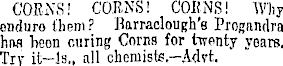 CORNS! CORNS! COIfNS! Why oaduro {hem? Barraclough's Progandra hrw hcon curing Corns for twenty years, Try it—ls., all chemiste—Mvt.