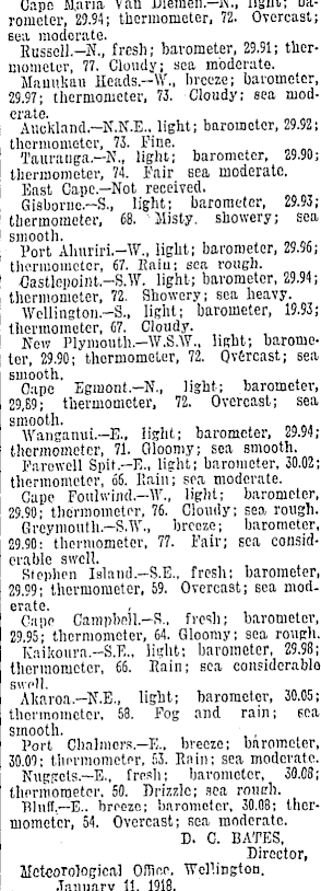 Cape Karia Van Diemen.—N„ light; barometer, 29.94; thermometer, 72. Overcast; sea moderate. Russell.—N., fresh; barometer, 29.91; thermometer, 77. Cloudy; sea moderate. Mauukau Heads.-\Y„ breeze; barometer, 29.97; thermometer, 73. Cloudy; sea modcrate. Auckland.—N.N.E„ light; barometer, 29.92; thermometer, 73. Fine. Taurauga.—N„ light; barometer, 29.90; thermometer, 74. Fair sea moderate. East Cape.—Not received. Gisborne.—S., light; barometer, 29.93; thermometer, 68. Misty, showery; sea smooth. , Port Almriri.—W„ light; barometer, 29.96; thermometer, 67. Rain; sea rough. Castlepoint—S.W. light; barometer, 29.94; thermometer, 72. Showery; sea heavy. Wellington.—S., light; barometer, 19.93; thermometer, 67. Cloudy. New Plymouth—W.S.W., light; barometer, 29.90; thormomcter, 72. Qvtrcast; sea smooth. Cape Eginont—N., light; barometer, 29,59; thermometer, 72. Overcast; sea smooth. , Wanganui—E., light; barometer, 29.94; thermometer, 71. Gloomy; sea smooth. Farewell Spit—E., light; barometer, 30.02; thermometer, 66. Rain; sea moderate. Cape Foulwind.-W., light; barometer, 29.90; thermometer, 76. Cloudy; sea rough. Greymouth.—S.W., breeze; barometer, 29.90: thermometer, 77. Fair; sea considerable swell. Stephen Island.-S.E., fresh; barometer, 29.99; thermometer, 59. Overcast; sea moderate. Cape Campbell.—S.. fresh; barometer, 29.95; thermometer, 64. Gloomy; sea rough. Kaikoura.—S.E., light; barometer, 29.98; thermometer, 66. Rain; sea considerable swell. Akaroa.—N.E., light; barometer, 30.05; thermometer, 58. Fog and rain; 6ea smooth. Port Chalmers.—E.. breeze; barometer, 30.09; thermometer, 53. Rain; sea moderate. Nuggets.—E., fresh; barometer, 30.08; thermometer. 50. Drizzle; sea rough. Bluff —E.. brooze; barometer, 30.08; thermometer, 54. Overcast; sea moderate. D. C. BATES, Director, Meteorological Office. Wellington. January 11, 1918.
