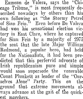 Eamonn de Valera, says. the "Chicago Tribune," is most frequently described nowadays by others than his own following as "the Stormy Petrel of Sinn Fein." Even before De Valera had won his sensational election victory in East Clare, where he captured for Sinn Fein by a majority of 2975 the seat that the late Major William Redmond, a popular hero, had held for the Nationalists, it had been predicted that this perfervid advocate of Irish republicanism pure and 'simple would soon supersede, the venerable Count Plunkett as leader of the "Ourselves Alone" Party. This on the ground that extreme movements always advance at the gait of the quickest marchers.