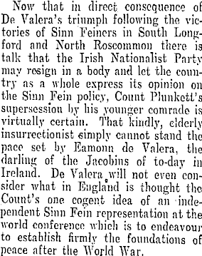 Now that in direct consequence of Dr Valera's triumph following the victories of Sinn Feiners in South Longford and North Roscommon there is talk that the Irish Nationalist Party may resign in a body and let the country as a whole express its opinion on the Sinn Fein policy, Count PlunkeU's supersession by his younger comrade is virtually certain. That kindly, elderly insurrectionist simply cannot stand the pace set by Eamonn do Valera, the darling of the Jacobins of to-day in Ireland. De Valera will not even consider what in England is thought the Count's one cogent idea of an independent Sinn Fein representation at the world conference which is to endeavour to establish firmly the foundations of peace after the World War.