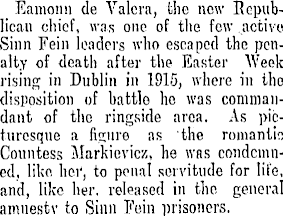 Eamonn de Valera, the new Republican chief, was one of the few active Sinn Fein leaders who escaped the penalty of death after the Easter Week rising in Dublin in 1915, where in tho disposition of battle he was commandant of the ringside area. As picturesque a figure as the romantic Countess Markievicz, he was condemned, like, her, to penal servitude for life, and, like her. released in the general amuestv to Sinn Fein prisoners.