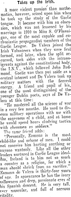 Takes up the Irish. A more violent passion than mathematics, however, seized upon him when he took up the study of the Gaelic tongue. It became with him an obsession, which was not lessened by his marriage in IDIO to Miss S. O'Flanmgan, one of the most capable and enthusiastic propagandist members of the Gaelic League. De Valera joined the Irish Volunteers when they were hrst. formed, and later, when the split occurred, took sides with the mtransiecants against the constitutional hody, the I N V., which followed John Redmond. Gaelic was then put aside as a central interest and De Valera look up military matters with the fiercest cmvoy. A friend and pupil of Ins, one of the most distinguished of the younger Dublin poets, says of De \ alera at this time: "He mastered all the science of war in a very few months. He used to discuss military operations with me with the eagerness of a child, and at home he would spend hours studying tactics with chessmen as soldiers. The same friend adds:_ "Personally, Eamonn is the most chiid-like and urbane of men. I could not conceive him hurting anything or anvono wantonly. Like all the other leaders nurtured in Gaelic League idealism' Ireland is to him not so much a country as a religion, for which a man should shrink from no sacrifice. Eamonn de Valera is thirty-four years of a"c In apuearance he has the ivory sallowness and deep, passionate eyes of his Spanish descent He is very tall, very muscular, and full of nervous vitality. _______