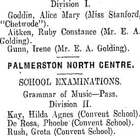 Division I. Goddin, Alice Mary (Miss Stanford, "Chetwode"). Aitken, Ruby Constance (Mr.-E. A. Golding). Gunn, Irene (Mr. E. A. Golding). PALMERSTON NORTH CENTRE. SCHOOL EXAMINATIONS. Grammar of Music—Pass. Division 11. Kay, Hilda Agnes (Convent School). De Rosa, Phoebe (Convent School). Rush, Greta (Convent School).
