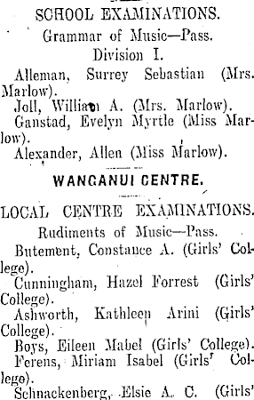 SCHOOL EXAMINATIONS. Grammar of Music—Pass. Division I. Alleinan, Surrey Sebastian (Mrs. Marlow). Joll, William A. (Mrs. Marlow). Ganstad, Evelyn Myrtle (Miss Marlow). Alexander, Allen (Miss Marlow). WANGANUI CENTRE. LOCAL CENTRE EXAMINATIONS. Rudiments of Music —Pass. Butement, Constance A. (Girls' College). Cunningham, Hazel Forrest (Girls' College). Asliworth, Kathleen Arini (Girls' College). Boys, Eileen Mabel (Girls' College). Fe'rens, : Miriam Isabel (Girls' lege)Sclinackenberg,- -Elsie A„ C. (Girls'