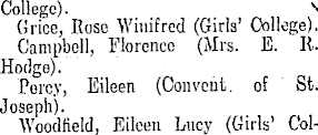 College). *> Grice, Rose Winifred (Girls' College). Campbell, Florence (Mrs. E. R. Hodge). Porcy, Eileen (Convent, of St. Joseph). Woodfield, Eileen Lucy (Girls' Col-