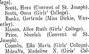 lege). Scott, Hera (Convent of St. Joseph). Scott, Oona (Girls' College). Banks, Gertrude (Miss Dickie, AYaverley). Mason, Alice Ruth (Girls' College). Price, Slieelah (Conveut of St. Joseph). Coombs, Ella Mavis (Girls' College). Mitcalfe, Madeline N. (Girls' Col-
