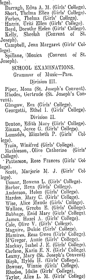 lege). Darragh, Edna A. M. (Girls' College). Short, Thelma Ellen (Girls' College). Forbes, Thelma (Girls' College). Harris, TJriti Ellen (Girls' College). Boyd, Dorothy Helen (Girls' College). ' Kelly, Sheelah (Convent of St. Joseph). Campbell, Jean Margaret (Girls' College). Spillane, IMonica (Convent of St. Joseph). SCHOOL EXAMINATIONS. Grammar of Music—Pass. Division 111. Piper, Mona (St. Joseph's Convent). Rhodes, Gertrude (St. Joseph's Convent). Glasgow, Eva (Girls' College). Georgetti, Ethel i. (Girls' College). Division 11. Denton, Edith Mary (Girls' College). Zinzan, Joyce G. (Girls' College). LumsdeNi, Elizabeth P. (Girls' College). Train. Winifred (Girls' College). Mathieson, .Olive Catherine (Girls' College). ' Patterson, Rose Frances (Girls'' College). Scott, Marjoric M. J. (Girls' College). Usmar, Rowcna L. (Girls' College). Barber, Rena (Girls' College). Andorson, Helen (Girls' College). Harden, Mary C. (Girls' College). Wise, Alice Maude (Girls' College). Wallace, Grecba E. (Girls' College). Babbage, Enid Mary (Girls' College). James', Hazel A. (Girls' College). Cole, Olive V. (Girls' College). Maguire, Dulcie (Girls' College). Blaraires, Rosa Given (Girls' College). M'Gregor, Annie (Girls' College). Mackay, Isabel J. E. (Girls' College). Carlson, Karin E. N. (Girls' College). Leamy, Mary (St. Joseph's Convent). Birph, Hylda H. (Girls' College). Downer, 'Winnie (Girls' Collego). Rhodes, Idalio (Girls' College). Taylor, Alice L. M. (Girls' College).
