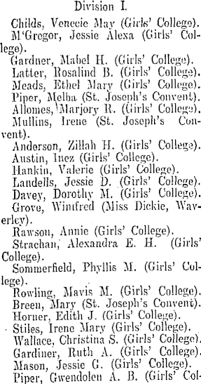 Division I. Childs, Venecie May (Girls' College). M Grogor, Jessie Alexa (Girls' College). Gardner, Mabel H. (Girls' College). Latter, Kosalind B. (Girls' College). Meads, Ethel Mary (Girls' College). Piper, Melba (St. Joseph's Convent). Allonies,Ularjory R. (Girls' Collegs).. Mullins, Irene (St. Joseph's Convent). Anderson, Zillah H. (Girls' Collegs). Austin, Inez (Girls' College). Hanlnii, Valerie (Girls' College). Landells, Jessie D. (Girls' College). Davey, Dorothy M. (Girls' College). Grovu, Winifred (Miss Dickie, Waverley). Rawsou, Annie (Girls' College). Strachan,' Alexandra E. H. (Girls' College). Sommerfield, Phyllis M. (Girls' College). Rowling, Mavis M. (Girls' College). Breen, Mary (St. Joseph's Convent). Horner, Edith J. (Girls' College). ■ Stiles, Irene Mary (Girls' College). Wallace, Christina S. (Girls' College). Gardiner, Ruth A. (Girls' College). Mason, Jessie G. (Girls' College). Piper, Gwendolen A. B. (Girls' Col-