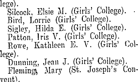 lege). Silcock, Elsie M. (Girls' College). • Bird, Lorrie (Girls' College). Sigley, Hilda E. (Girls' College). Patten. Iris V. (Girls' College). Rowe, Kathleen E. V. (Girls' ColDunning, Jean J. (Girls' College). Fleming), Mary (St. Joseph's Convent).