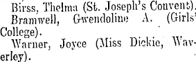 Birss, Thelma (St. Joseph's Convent). Bramwell, Gwendoline A. (Girls' College). Warner, Joyce (Miss Dickie, Waverley).