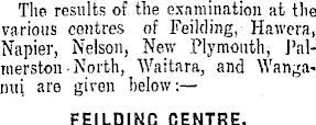 The results of the examination at the various centres of Feilding, Hawera, Napier, Nelson, New Plymouth, J'almerston • North, Waitara, and Wangam\\ are given below:— FEILDINC CENTRE.