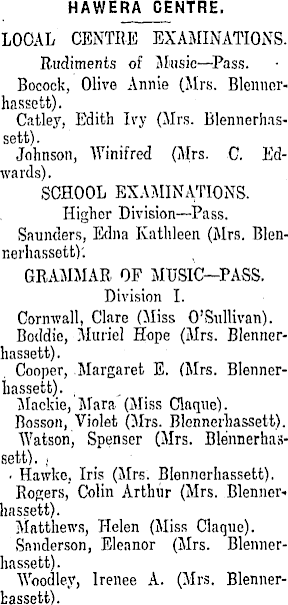 HAWERA CENTRE. LOOAL CENTRE EXAMINATIONS. Rudiments of Music—Pass. Bocock, Olive Annie (Mrs. Blennerliassett). Catley, Edith Ivy (Mrs. Blennerhassett). Johnson, Winifred (Mrs. C. Edwards). SCHOOL EXAMINATIONS. Higher Division—Pass. Saunders, Edna Kathleen (Mrs. Blennerhassett)'. GRAMMAR OF MUSIC-PASS. Division I. Cornwall, Clare (Miss O'Siillivan). Boddie, Muriel Hope (Mrs. Blennerhassett). Cooper, Margaret E. (Mrs. BlennerLassett). , Mackie, Mara (Miss Claque). Bosson, Violet (Mrs. Blennerliassett). Watson, Spenser (Mrs. Blennerhassett). , • Hawke, Iris (Mrs. Blennerliassett). Rogers, Colin Arthur (Mrs. Blennerliassett). Matthews, Helen (Miss Claque). Sanderson, Eleanor (Mrs. Blennerliassett). Woodier, Irenee A. (Mrs. Blennerbassett).