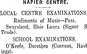 NAPIER CENTRE. LOCAL CENTRE EXAMINATIONS. Rudiments of Music—Pass. Swaysland, Elsie Laura (Signor S. Trudaj. SCHOOL EXAMINATIONS. O'Keefe, Dorothea (Convent, Hastings).