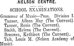 .NELSON CENTRE. SCHOOL EXAMINATIONS. Grammar of Music—Pass. Division I. Tanner, Ailecn May (Tiie Convent). Tanner, Rosie (Tlie'Couvont). Smith, Helena (The Convent). Brennan, Kathleen (The Convent).. Tait, Louis M. (Nelson Academy of Music).