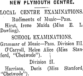 NEW PLYMOUTH CENTRE. LOCAL CENTRE EXAMINATIONS. Rudiments of Music—Pass. Hirst, Irene Maida (Miss E. L. Dowling). SCHOOL EXAMINATIONS. Grammar of Music—Pass. Division 111. O'Carroll, Helen Alice (Mies Stanford, "Chetwode"). \ Division 11. Harrison, Doris (Miss Stanford, "Chetwode").