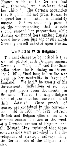 France, which, as tho Germans had often threatened, would at least "bleed her white." Tho German accusation that England did not press Russia to ■ suspend her mobilisation is absolutely i untrue. But ws could only press it on tho understanding that Austria should suspend her preparations while Austria continued liors against Russia would have boon just tho insult which Germany herself inflicted upon Russia. i We Plotted With Belgium! Tho final charge to bo noticed is that wo hail plotted with Belgium against Germany. "Belgium," said tho Chancellor before tho Reichstag on Decombor 2, lOl'l, "had long before tho war given up her neutrality in favour of England. We had," ho asserts of his Government, "indications of it, but only got proofs from documents in Brussels. There, tho Anglo-Belgian plans of. war have-been unveiled in all their c'otails." _ These proofs, of courso, aro contained in the conversations hold in 1906 and 1912 between British and Belgian officers as to a. common courso of action in the event of a German invasion of Belgium, and Sir Edward Cfrcy explained that theso conversations were provoked by tho development of strategic railways along the German sido of tho Belgian frontier.