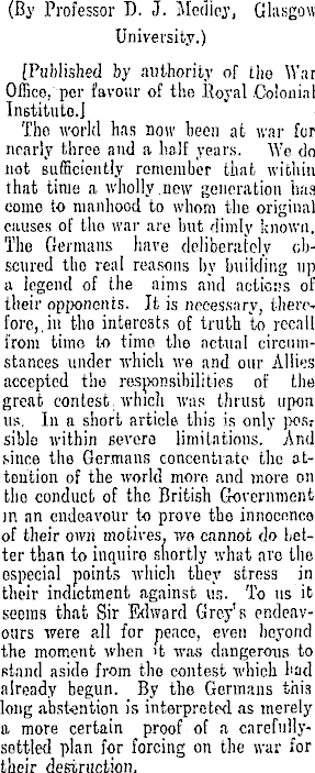 (By Professor D. J. Mediey, Glasgow University.) [Published by authority of the War Office, per favour of the Koyal Colonial Instituto.J Tho world has now heen at war for nearly three and a half years. We do not sufficiently remember that within that time a wholly new generation has come to manhood to whom the original causes of tho war are hut dimly known. The Germans have deliberately obscured the real reasons by building up a legend of the aims and actions of [ their opponents. It is necessary, therefore,, in the interests of truth to recall from timo to time tho actual circumstances under which we and our Allies accepted tho responsibilities of the great contest, which was thrust upon us. In a short article this is only pos T sible within severe limitations. And since the Germans concentrate the attention of the world more and more on tho conduct of the British Government in an endeavour to prove the innocence of their own motives, we cannot do better than to inquire shortly what aro the especial points which they stress in their indictment against us. To us it seems that Sir Edward Grey's endeavours were all for peace, even beyond I the moment when 't was dangerous to stand aside from tho contest which had already begun. By the Germans thin long abstention is interpreted as merely a more certain proof of a carefullysettled plan for forcing on the war for their destruction.