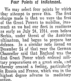 Four Points of Indictment. We may select four points by which they attempt to prove this. The first charge made is that we were the first of the Great Powers to mobilise, inasmuch as we had our fleet in readiness as early as July 24, 1914. even beforo Serbia, under threat of the Austrian ultimatum, had begun to prepare ber defence. In a circular note issued on December 24 of that rear the German Chancellor said that England was the first Great Power which ordered military preparations on a great scale, tnd thereby created a feeling, particularly in Russia and France, which was in the highest degree adverse to mediatory action.
