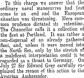 To this charge we answer that the ordinary naval manoeuvres had just conw to an end and tho European situation was threatening. Mere common prudence dictated its retention. The Chancellor calls it a collection of the fleet at Portland. It was rather a non-dispersal of an already gathered fleet, and, unless it were moved into the North Sea, only by the stretch of a. maleficent interpretation could it be regarded as a threat to Germany. On July 27 Sir Edward Grey carefully explained the reason of this action to tho Austrian Ambassador.