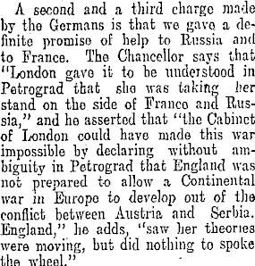 A second and a third charge made by the Germans is that we gave a definite promise of help to Russia and to France. The Chancellor says that "London gave it to be understood in Petrograd that she was taking her stand on the side of Franco and Russia," and he asserted that "the Cabinet of London could have made this war impossible by declaring without ambiguity in Petrograd that England was not prepared to allow a Continental war m Europe to develop out of the conflict between Austria and Serbia. England," he adds, "saw her theories were moving, but aid nothing to spoke the wheel."