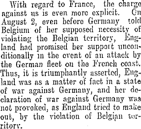 With regard to France, the charge against us is even more explicit. On August 2, even beforo Germany told Belgium , of her supposed necessity of violating the Belgian territory, England had promised her support unconditionally in the event of an attack by the German fleet on the French coast. Thus, it is triumphantly asserted, England was as a matter of fact in a state of war against Germany, and her declaration of war against Germany was not provoked, as England tried to make out, by the violation of Belgian territory.