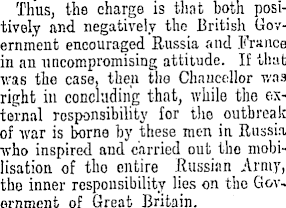 Thus, the charge is that both positively and negatively the British Government encouraged Russia and France in an uncompromising attitude. If that was the case, then the Chancellor was right in concluding that, while the external responsibility for the outbreak of war is borne by these men in Russia who inspired and carried out the mobilisation of tho entire Russian Army, tho inner responsibility lies on the Government of Great Britain.