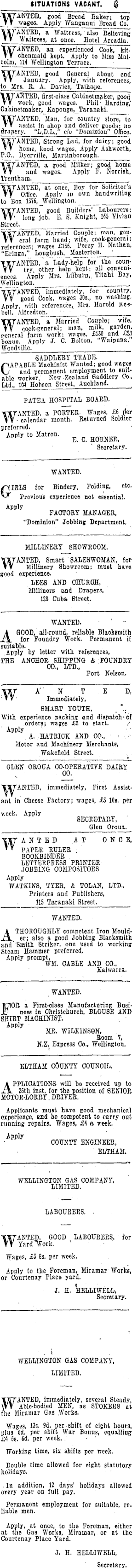 •ITUATIONS VACANT. Q WANTED, good Bread Baker; top wages. Apply Wanganui Bread Co. W' ANTED, a Waitress,' also Relieving Waitress, at once. Hotel Arcadia. WANTED, an experienced Cook, kitchenmaid kept. Apply to Mica Maicolm, 114 Wellington Terrace. WANTED, good General about end January. Apply, with references, to Mrs. R. A. Daviea, Taihape. W'AHTED, first-clans Cabinetmaker, good work, good wages. Phil- Harding; Cabinetmaker, Kaponga,_Taranaki. _ WANTED, Man, for oountry store, to aßßist in shop and deliver goods; no drapery. "L.D.L.," c/o "Dominion" Office. W' ANTED, Strong Lad, for dairy; good home, kood wages. Apply Ashworth, P. 0., Dyerville, Martinborough. WANTED, a good Milker; good home and wa«es. Apply I'. Norrish, Trentham. , WANTED, at once, Boy for Solicitor's Office. Apply in own handwriting to Box 1376, _We*llington. "a'TTANTED, good Builders' Labourers; VV' long job. E. S. Knight, 165 Ylvlan Street! . WANTED, Married Couple; man, general farm hand; wife, cook-generai; references; wages £156. Percy H. Nathan, "Erinea," Longbush. Masterton. ANTED, a Lady-help for the counTT try. other heln kept ; all conveniences. Apply Mrs. Lilbuni,. Titahi Baj, Wellington. ; , WANTED, immediately, for country, TV good Cook, wages 30b., no washing. Apply, with references, Mrs. Harold Kc<bull, Alfredton. _ ' '' WANTED, a Married Couple; wife, <;ook-genoral; man, milk, garden, general {arm work; wages, £130 and £20 bonus. Apply J. C. Bolton, "Waipuna, Woodville. SADDLERY TRADE. CAPABLE Machinist Wanted; good wages and permanent employment to suitable worker. New . Zealand Saddlery Co., Ltd., 104 Hohson Street, Auckland. PATEA HOSPITAL BOARD. WANTED, a PORTER. Wages, £6 ller calendar month. Returned Soldier preferred. Apply to Matron. r r SOENEEi ■ Secretary. WANTED. GIRLS for Bindery. Folding, etc. Previous experience not essential. Apply FACTORY MANAGER, "Dominion" Jobbing Department. MILLINERY SHOWROOM. WANTED, Smart (SALESWOMAN, for Millinery Showroom; mnst have good experience. LEES AND CHURCH, Milliners and Diapers, 128 Cuba Street. WANTED. ' - A GOOD, all-round, reliable Blacksmith for Foundry Work. Permanent if suitable. Apply by letter with references, THE ANCHOR SHIPPING & FOUNDRY CO., LTD., Port Nelson. 7 N T E D, Immediately, SMART YOUTH, _ With experience packins and dispatch-of order?; wages £2 to start. 'Apply A. HATRICK AND CO.. Motor and Maohinery Merchants, Wakefield Street. GLEN OROUA 00-OPERATIYE DAIRY CO. immediately, First Assistant in Cheese Factory; wages, £3 10s. per week. Apply SECRETARY, Glen Oroua. WANTED AT ONCE, PAPER RULER BOOKBINDER LETTERPRESS PRINTER JOBBING COMPOSITORS Apply WATKINS, TYER. <5, TOLAN, LTD.. Printers and Publishers, 115 Taranaki Street. WANTED. A THOROUGHLY competent Iron Moulder; also a eood Jobbing Blacksmith and" Smith Striker, one used to working Steam Hammer preferred. Apply prompt, WM. CABLE AND CO., Kaiwarra. , WANTED. J7IOR a Firstrolasß Manufacturing Busii ness In Christchurch, BLOUSE AND SHIRT MACHINIST. Apply MR. WILKINSON, Boom 7, N.Z. Express Co., Wellington. ELTHAH COUNTY COUNCIL. Applications will he received up to 25th inst, for the position of SENIOR MOTOR-LORRY. DRIYER. Applicants must have good mechanical experience, and be competent to carry out running repairs. Wages, £4 a week. Apply COUNTY ENGINEER, ELTHAIf. WELLINGTON GAS COMPANY, LIMITED. LABOURERS. . WANTED, GOOD , LABOURERS, for Yard work. Wages, £3 Bs. per week. Apply to the Foreman, Miramar Works, or Courtenay Place yard. J. H. HELLIWELL, Secretary. WELLINGTON GAS COMPANY, LIMITED. WANTED, immediately, several Steady, Able-bodied MEN, as STOKERS at (he Miramar Gaa .Works. Wages, 13s. 9d. per shift of eight hours, plus 6d. per shift War Bonus, equalling £4 ss. 6d. per week. . Working time, six shifts per week. Double time allowed for eight statutory holidays. .In addition, 12 dayß' holidays allowed GTcry year on full pay. Permanent employment for suitable, re. liable men. Apply, at once, to the Foreman, either at the Gas Works, Miramar, or at the Courtenay Place Yard. J. H, HELLIWELL, Secretary.
