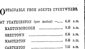 QBTAINABLE FROM AGENTS EVERYWHERE AT 'FEATHERSTON (per motor) - 6.30 a.m. MXETINBOROUGH 9.30 a.m. GREYTOWN 8.30 a.m. MASTERTON 8.30. a.m, CARTERTON W5 a.m.