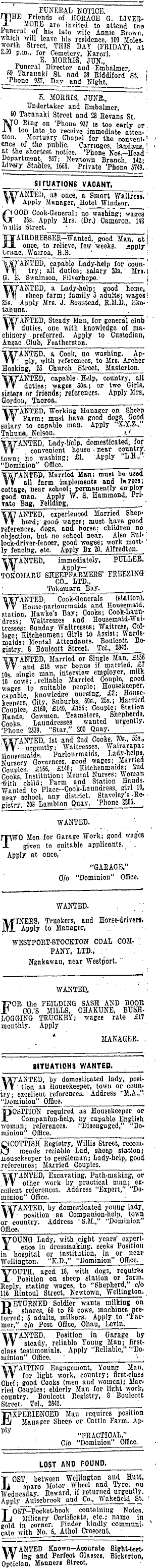 T FUNERAL NOTICE. HE Friends of HORACE G. LIVERMORE are invited to attend tiio Funeral of his lato wife Annie Brown, which will leave his residence,- 109 Molesyorth Street, THIS DAY (FRIDAY), at 2.30 p.m., for Cemetery, Karori. E. MORJtIS, JTJN., Funeral Director and ■ Embalmer, 60 naraitaki St. and 28 Riddiford St. Phone 937, Day and Night. ! E. MORRIS, JUKB., Undertaker and Embalmer, 60 Taranaki Street and 28 Rovans St. Ring on 'Phone 937 is too early or. 11 too late > receive immediate atten- : tion. Mortuary Chapel for the oonvenl.' ' ence of the public. Carriages, landaus,! > at the shortest notice. 'Phone Nos.—Head : Department. 937; Nevrtovra Branch, 142; Livery Stables, 1668. Private 'Phone 3749.. SITUATIONS VACANT, WANTED, at once, a Smart Waitress.' Apply Manager, Hotel Windsor. GOOD Cook-General; no washing; wages 255. Apply Mrs. (Dr.). Cameron, US V lllis Street. j HAIRDRE6SER— Wanted, good Man, atl onoe, to relievo, few weeks. .apply urane, Wairoa, H.B. ' WI'ANTED, capable Lady-help for coun-' i?| try; all duties; salary 20s. Mrs.l G. £. Swainaon, Pilverhope. j WANTED, a Lady-help; good home, sheep farm; family 3 adutts; -wages' £ss. Apply Mrs. J. Boustead, R.M.D., Eke--tahuna. ANTED, Steady Man, for general club duties, one with knowledge of machinery preferred. Apply to Custodian, Anaac .Club, Featherston. WANTED, a Cook, no washing. Apply, with references, to Mrs. Archer i Hosking, £5 Churoh Street, Masterton. WANTED, capable • Help, country, all duties; wages 305.; or two Girls, sisters (it friends; references. Apply Mrs, Gordoii, Taoroa. ' ANTED, Working Manager on Shefep Farm; must have good dogs. Good salary to capable man. Apply "X.Y.Z.,' Tahunai, Nelson. i' WANTED, Lady-h'elp, domesticated, for convenient houEe • near country, town; iio washing; £1. Apply "L.H., "Dominion" Office. ANTED, Married Man; must be used all farm implements and buses; cottage, near school [permanently 6irploy good man. Apply W. 8. Hammond, Prl* Tate Bag, Fellding, ' ' WANTED, experienced Married Shepherd ; good l wages; must have good references, dogs, and horse; children no objection, but no school near. Also Rul-lock-driver-fenoer, good "wages; work mo«t- 1 ly fencing, etc. Apply Bx 20. Alfredton. ANTED, immediately, PULLER. Apply— TOKOMARU SHEEPFARMERS' FREEZING CO., LTD., ; Tokomaru Bay. . WANTED: Cook-Generals (station), House-parlourmaids and Housemaid, station, Hawke's Bay; Cooks; Cook-Laun-I dress; Waitresses and Housemaid-Wai-tresses; Sunday Waitresses; Waitress, College; Kitchenmen; Girls t6 Assist; Wardsmaids; Mental Attendants. Boulcott Registry. 8 Bftuloott Street. Tel., 2841. ANTED, Married or Single Man, £156 and £15 war bonus if married. £7 10s single man, interview employer, milk 10 ' cows; , reliable Married Oouple. good wages tp suitable people; Housekeeper, capable, knowledge nursing, £2; Housekeepers, City, Suburbs, 305., 255.; Married Couples, £160, £140, £156; Couple; Station Hands, Cowmen, Teamsters, Shepherds, Cooks, Laundresses wanted urgently. 'Phone 2339. "Star." 200 Quay. WANTED, Ist and 2nd Cooke, 705., 555„ urgently; Waitresses, Wairarapa; Housemaids, Parlourmaids, Lady-helps, Nursery Governess, good wages; Married Couples, £156, £140; Kitchenmaids; 2ud Cooks, Institution; Mental Nurses; Woman •fi'itli child; Farm and Station Hands. Wanted to Place-Cook-LaundreßS g;rl 10, near sohool, any district. Staveley 3- Hegistry. 206 Lamblon Quay. Phone 2206. i WANTED. TWO Men for Garage Work; good wages given to suitable applicants. _ Apply at once," "GARAGE." O/o "Dominion" Office. WANTED. , MINERS, Truckers, and Horse-drivers. Apply to Manager, WESTPORT-STOCKTON COAL COMPANY, LTD., : Ngakawau, near Westport. WANTED, • FOR the FEILDING SASH AND DOOR CO.'S MILLS, OHAKUNE, BUSHLOGGING TRUCKEY; wages rate £17 monthly. Apply * MANAGER. . HTUATIQHB WANTEO. WANTED, by domesticated lady, position as Housekeeper, town or country; excelieut references. Address - 'M.A.,""Dominion" Office. POSITION required as Housekeeper or Companion-help, by capable English woman; references. "Disongaged," "Dominion" SCOTTISH Registry, Willis Street, recommends- reliable Lad, aheqp station; Housekeeper to gentleman; Lady-help, good references; Majried Couples. ' W 'ANTED, Excavating, Path-making, or other work by practical man; excellent references. Address "Expert," "Dominion" Office. : WANTED, by domesticated young lady, position as Companion-help, _ town or country. Address ' 5.M.," "Dominion" Office. YOUNG Lady, with eight years' experience in dressmaking, seekß Position in hoßpital or institation, in or near Wellington. "K.D.," "Dominion" Office. YOUTH, aged 18, with dogs, requires Position on Bheep . station or farm. Reply, stating -wages, to "Shepherd," c/o lit Rintoul Street, Newtown, Wellington. RETURNED Soldier wants milking on shares, 60 to 80 cows, machines preferred; 3 adults, milkers. Apply to "iarmer," c/o Post Office, Ohau, Levin* WANTED, Position in Garage by ' steady, reliablo Young Man; firstclass testimonials. Apply "Reliable," '"Dominion" Office. '• ; WAITING Engagement, Young Man, for light work, country; first-class Chef; good Cooks (men and women); Mar' ried Couples; elderly Man for light work, country. Boulcott Registry, 8 Boulcott Street. Tel., 2841. XPERIENOED Man requires position Manager Sheep or Cattle Farm. Ap--I,ly "PRACTICAL." C/o "Dominion" Office. LOST AND FOUND. LOST between Wellington and Hutt, spare Motor Wheel and Tyro, on Wednesday. Reward, if returned urgently. Apply Anlsobrook and Co.. Wakefield St. LOST— Pocket-book containing Noteß, Military Certificate, etc.; name in gold in cornor. Finder kindly commuuicato with No. 6. Athol Orescent. WANTED Known—Aeourate Sight-test-ing and Perfeot Glasses, Bickcrton, Optician, Manners Street.
