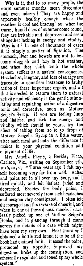 Why is it, that to so miny people, the warm summer months mean discomfort ami! even misery ? Thay are happy and apparently healthy _ enough when the weather is cool and bracing,' bat when the warm, humid days of summer come round, Ihey are irritable and deprwed and seem altogether lacking in energy and vitality. Why is it ? Iu tens of thousands of eases it is simply a matter of digestion, The stomach, liver and bowels are apt to become sluggish and lazy in hot weathor, amd when thoj shirk ivork the whole system sniffers as a natfjral consequence. Headachen, languor, and loss of energy are traceable in countless instances to faulty action of these important organs, and ail that is naided to restore them to natural activity and efficiency is the gentle stimulating and regulating action of a digestive tonic and corrective, such as Mother SeigelV. Syrup. If yon are feeling limp and listless, and lack the energy and vitality which should be yours, try the cffoct of taking from 30 to 30 drops ot Mother Soigel's Syrup in a little water, after each meal and note the difference it mokes in your physical condition and enjoyment of life. Mre. Amelia Payne, 2 Berkley Place, Carlton, Vic., writing on September 7th, 1916, says" Three years ago I felt myself becoming very far from well. Aches and pains set in all over my Vody, and I tired quickly and felt listless, jaded and depressed. Besides the body pains, I suffered most severely from sick headaches and became very constipated., I often felt discouraged aud the reverse of chearful, and when in one of these dismal moods I carelessly picked up one cf Mother Seigel'9 Books, and in glancing through it came across the details of a case which might have been ray very own. Next inorning I obtained a bottle aud found it to be all the book had claimed for it. It eased the pains, promoted my appetite, improved my digestion, broke up the constipation, and efficiently regulated and toned up ray whole system."
