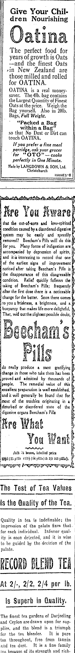 Give Your Children Nourishing Oatina The perfect food for years of growth is Oats —and the finest Oats fin New Zealand are those milled and rolled for OATINA. OATINA is a real moneysaver. The 41b. bag contains the Largest Quantity of Finest Oats at the price. Weigh the Bag yourself. Also in 201b, Bags, Full Weight. "Packed a Bag within a Bag" so that No Dust or Dirt can touch OATINA. If you prefer a fine meal porridge, ash your grocer for ' OTQ"'—cooks perfectly in One Minute. MitJe bjr LANGDOWN & SON, Ltd. Chriitchurch HAINES-B | Are Yea ft ware) j lhal the out-of-iorti and lowspiritcd C f condition caused by & ditorde.red digeoivt c j syitera may be cuiiy Mid speedily C * rsmoved? Bescham's Pills will do this S { for you. Many forma of indigestion arc & | accompanied by depression of spirits, K J and it ii interesting to record that one K f of the earliest signs of improvement K | noticed after taking Beecham's Pills is» 5 the disappearance of this disagreeable < condition. Relief quickly follows the j? ' taking of Beecham's Pills; frequently p ! after the first dose there is a noticeable j) i change for the better. Soon there comes L j to you a briskness, & brightness, and il ; buoyancy fliat makes life more delightful, ft j That, wii but the slightest possible doubt, w ißeechams Fills !do really produce a most gratifying a ( change in those who take them has been if | proved and admitted by thousands of j? '{ people. The remedial value of this K ! excellent preparation is wall established, r£ ' and it will generally be found that for f, j most of the troubles originating in a V f disturbed or disordered slate of the jj S digestive organs Beecham's Pills [fj IKre What I You Want! ij J toO. bojees, Übtllul prks t jiioji 133pi11! ii/ii(Mpill')&2/3 teapilSsf, The Test of Tea Values Is the duality of the Tea.; Quality in tea is indefinable; tho impression of the palate fixes that. for each individual. Inferior quality is soon detected, and it is wise lo be guided by the decision of the palate. leom BLEND IEI At 2/-, 2/2, 2/4 per lb. is Superb in Quality. The finest tea gardens of Darjeeling and Ceylon are drawn upon for supplies, and the blend is a triumph for the tea blender. It is pure tea, throughout, free from tannin tea dust. It is a fino family ten because of its strength and rich-