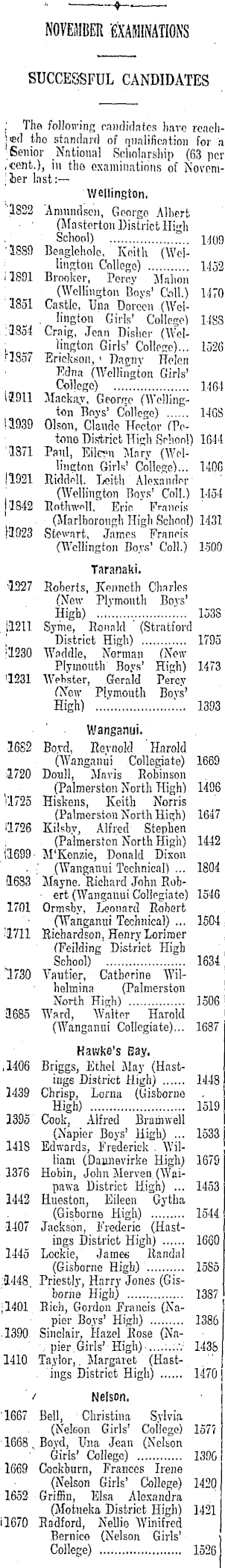 , , NOVEMBER EXAMINATIONS SUCCESSFUL CANDIDATES ; The following candidates have roachjed tho standard of qualification for 'a Senior National Scholarship (63 per ,cent.), in tho examinations of November last: — Wellington. '1822 Amundsen, Gcorgo Albert (Masterton District High School) 1409 '1889 Beagleholo, Keith (Wellington. College) . 1452 11891 Brooker, Porcv Mahon (Wellington B'oys' Coll.) 1470 1851 Castle, Una Dorcen (Wcl- . lington Girls' College) 1488 :180-i Craig, Jean Disher (Wol- , 'lington Girls' College)... 1526 n857 Erickson, ' Dasniy Helen Edna (Wellington Girls' College) 1464 12911 Mackay, George (Wellington Boys' College) 1468 11939 Olson, Claude Hector (Pctone District High School) 1644 1871 Paul, Eilem Mary (Wellington Girls' College)... 140G 11921 Riddell. Loith Alexander (Wellington Bovs' Coll.) 1454 1842 Rotlvwrli. Erie Francis . (Marlborough High School) 1431 13923 Stewart, James Francis (Wellington Boys' Coll.) 1500 Taranaki. ■1227 Roberts, Kenneth Charles (New Plymouth Bovs' High) .'... 103S 3211 Syfne, Ronald ' (Stratford District High) 1795 11230 Waddle, Norman (New Plymouth Boys' High) 1473 '1231 Webster, Gerald Percy (New Plymouth Bovs' High) 1393 Wanganui. 1682 Boyd, Reynold Harold (Wanganui Collegiate) 1669 1720 Doull, Mavis Robinson (Palmerston North High) 1496 '',1725 Hiskens, Keith Norris (Palmerston North High) 1647 H726 Kilsbv, Alfred Stephen (Palmerston North High) 1442 11699- M'Kenzie, Donald Dixon . ' (Wanganui Technical) ... 1804 !1683 Mayne. Richard John Rob- - ert (Wanganui Collegiate) 1546 1701 Ormsby, Leonard Robert (Wanganui Technical) ... 1504 1711 Richardson, Henry Loriraer (Feilding District High School) 1634 1730 Vautier, Catherine AVilhelmina (Palmerston North High) 1506 1685 Ward, Walter Harold (Wanganui Collegiate)... 1687 Hawke's Bay. ,1406 Briggs, Ethel May (Hastings District High) 1448 1439 Chrisp, Lorna (Gisborae High) 1519 1395 Cook, Alfred Brarhwell (Napier Boys' High) ... 1533 1418 Edwards, Frederick . William (Dannevirke High) 1679 1376 Hobin, John Merven. (Waipawa District High) ... 1453 1442 Hueston, Eileen Gytha (Gisborne High) 1544 1407 Jackson, Frederic (Hastings District High) 1660 1445 Lockie, James Randal (Gisborne High) 1585 :1448 Priestly, Harry Jones (Gisborne High) 1387 j-1401 Rich, Gordon Francis (Napier Bovs' High) 1386 .1390 Sinclair, Hazel Rose (Na- , pier Girls' High)■....:.:// 1438 1410. Taylor,. Margaret (Hast- .." . ings District High) ...... 1470 / Nelson. 1667 Bell, Christina Sylvia (Nelson Girls' College) 157? 1668 Bovd, Una Jean (Nelson ■' Girls' College) 1396 1669 Cockburn, Frances Irene (Nelson Girls' College) 1420 1652 Griffin, Elsa Alexandra (Motueka District High) 1421 , 11670 Radford, Nellie Winifred Bernice (Nelson Girls' College) 1526 , i