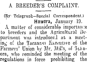A BREEDER'S COMPLAINT. (By- Telegraph—Special Correspondent.) Hawera, January 19. A matter of considerable importance to breeders and the Agricultural Department was introduced at a meeting of the Taratm-i JVAenutive of the Farmers' Union by Mr. .Mills, »f ']claora, who reminded the meeting of the regulations in force prohibiting the