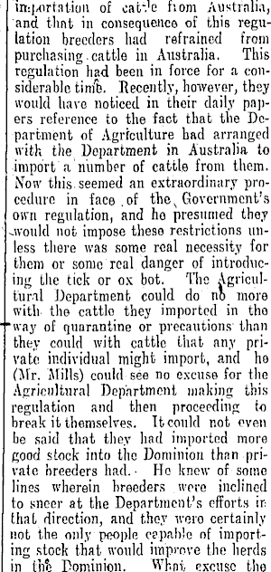 3 in:j,ort3tiou of cat'.'e horn Australia, I and thnt in consequence of this regur lation breeders had refrained from , purchasing. cattle in Australia. This regulation had been in force for a considerable tinfb. Recently, however, they would have noticed in their daily papers reference to the fact that the Department of Agriculture had arranged with the Department in Australia to ! import a number of cattle from them. 1 Now this, seemed an extraordinary procedure in face .of the s Government's own regulation, and ho presumed they ' -would not impose these restrictions un- , less there was some real necessity for them or some real danger of introducing the tick or ox bot. The Agricultural Department could do no more with the cattlo they imported in tho " "way of quarantine or precautions' than they could with cattle that any private individual might import, and he (Mr. Mills) could see no excuse for the Agricultural Department making this regulation and then proceeding to break it themselves. It could not even be said that they had imported more good stock into the Dominion than private breeders had. ■ Ho knew of some lines wherein hreeders were inclined to sneer at the Department's efforts in that direction, and they wero certainly not the only people capable nf importing stock that would improve the herds in thfc Dominion. Whni excuse the