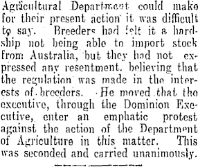 Agricultural Department could make for their present action' it was difficult to say. Breeder* hod f»lt it a hardship not being able tn import stock From Australia, but they had not expressed any resentment, believing that the regulation was made in tlio. interests of. breeders. ■Fe moved .that tho executive, through the Dominion Executive, enter an emphatic protest against the action of the Department of Agriculture in this matter. Tin's was seconded and carried unanimously.