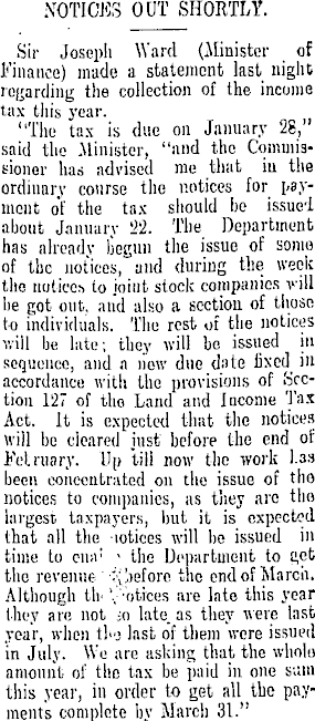 NOTICES OUT SHORTLY. Sir Joseph Ward (Minister of Finance) made a statement last night regarding the collection of the income tax tliis year. "The tax is due on January 28," said the -Minister, "and the Commissioner has advised me that in the ordinary course the notices for paymcnt of the tax should be issued about January 2-2. The Department has already begun the issue of some of the notices, and during the week the notices to joint slock companies will he got out, and also a section of those to individuals. The rest of the notices v.'ill be late; they will be issued in sequence, and a new due date lixed_ in accordance with the provisions of Section 127 of the Land and Income Tax Act. It is expected that the notices will be cleared just before the end of Felruary. Up "till now the work 1.33 been concentrated on the issue of the notices to companies, as they are tlm largest taxpayers, but it is expected that all the lotices will be issued in time to eiur - the Department to get the revenue before the end of March. Although tli' V'otices are late this year they are not -o late, as they were last year, when the last of them were issued in July. We are asking that the wholo amount of the tax be paid in one sum this year, in order to get all the payments complete by March 31."