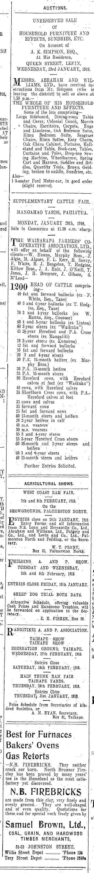 AUCTIONS. UNDESERVED SALE • ' Of HOUSEHOLD FURNITURE A XI) EFFECTS, SUNDRIES, ETC. On Account of A. K. SIMPSON, ESQ.,, At His Residence, QUEEN STREET, LEVIN, WEDNESDAY, 23rd JANUARY, WIS. MESSRS. ABRAHAM AND WIL LIAMS, LTD., have received in structions from Mr. Simpson (who i leaving tho district) to sell ns above a 1.30 p.m.— ' THE WHOLE OE HIS HOUSEHOLI FURNITURE AND EFFECTS. Some of the lots comprising— Large Sideboard, Dining-room Tabli and Cover, Colonial Couch, Morrii » Chairs, Escritoire, Carpets, Rugi and Linoleum, Oak Bedroom' Suite Iviinu Bedroom Suite, Seagrns Chairs,' Rimu Settee, Easy Chairs Oak China Cabinet, Pictures, Hall stand and Table, Book-case, Tabios Curtains and. Poles, -Drop-top Sew ing Machine, Wheelbarrow, Sprint Cart and Harness, Saddles and Bri dies, Quantity Tools, Brown Geld ing, broken to taddle, Sundries, etc Also— 1-5-seater Ford Motor-car, in good ordei (slight reserve). SUPPLEMENTARY CATTLE FAIR. MANG'AHAO YARDS, PAHIATUA. MONDAY, JANUARY 28th, 1918. Sale to Commence at 11.30 a.m. sharp The wairarapa farmers 1 co OPERATIVE ASSOCIATION, LTD. will • offer on behalf of the following clients:—W. Hanna, Murphy Bros .J Algie,,ll. Alpass, F, L. Kerr, H. Sowrv 11,l 1 , W'hito, B. J. Bengston, T. Hodgins Kittow Bros., J. A. Hair, J. .O'Neill, T Jones, J. H. Uvemner, J. Gibson.' S M'Leod— X3OO compris 40 fat and forward bullocks (ex-.'F White, Etiq., Tane) 40 3 and 4-year bullocks (ex T. Hodg ins, Esq., Tane) "0 3 and 4-year bullocks (ex W i Hanna, Esq., Coonoor) GO 4 and 5-year bullocks (ex Linton GO 3-yeai- steers (ex "Waikuku") ■13 2J-year Hereford and P.A. Cro& steers (ex Mangaliti) 18 3-year steers (ex Kunieroa) 12 fat and forward bullocks 10 fat and forward bullocks ' 20 3 and 4-year steers ' 30 P.A'. 15-month heifers (ex Mur phy Bros.) 30 P.A. 15-month heifers 25 P.A. 15-month steers 80 Hereford cows, with Horefor: calves at foot (ex "Waikuku" 40 cows, .with Hereford calves 35 Shorthorn Cross cows, with P.A. Hereford calves 4t foot 35 cows and calves 35 forward cows 25 fat and forward cows • 60 15-month steers and heifers 20 2-year heifers in calf 40 m.s. weaners' 30 m.s. weaners•• • 35 3 and 4-year steers 25 3-year Hereford Cross steers--00 18-month and 2-year steers an< heifers' , '60 3 and 4-year steers 40 15-month steers and heifers Further Entries Solicited. AGRICULTURAL SHOWS. WEST COAST KAM FAIR, 7th and Bth FEBRUARY, 1918. ' On the SHOWGROUNDS, PALJiERSTON NORTH. Entries close on 24th January, mii Entry Forms • and all informatioi from N.Z. Loan and Mercantile Co.. Ltd Abraham and Williams. Ltd., Palgety am Co., Ltd., and Levin and Co., Ltd., Pa] mcratou North and Fcildlng, or the Secre tary, W. T. PENNY; • Box 85, Palmerston North'. THIEILDING. A. AND P. SHOW TUESDAY' AND WEDNESDAY, sth and 6th February,. 1918. ENTRIES CLOSE FRIDAY, 18th JANUARY SHEEP DOG TRIAL BOTH . DAYS. Attractive Schedule, offeritfg : valuab] Cash Prizes and' Handsome Trophies, wl] be forwarded on application to the Sec retary,. - • .... E. H. FISHER, ;j?ox 98. A. AND P. ASSOOIATIOJ TAIHAPE • SHOW ; TAIHAPE SHOW- ■ ■ RECREATION GROUND, TAIHAPE, WEDNESDAY, 27th FEBRUARY, 1918. '' Entries Close . SATURDAY, 16th FEBRUARY,'I9IB. MAIN TRUNK RAH FAIR TAIHAPE YARDS, THURSDAY, 28th FEBRUARY, 1918. Entries Close 31st JANUARY, 1918. Prize Schedule from Secretaries of kill dred Societies, or A. 31. RYAN, Secretary, Box 81, Taihape. Best for Furnaces Bakers' Ovens Gas Retorts —N.B. FIREBRICKS'. They neithe crack nor burn. North Brunnor Fire clay has been proved by many year. l use in the Homeland as the most satif factory yet discovered. N.B. FIREBRICKS aro made from this clay, very finely an evenly ground.- They are "well-shape and of even quality. Quotations fo these, and for special work freely given b Samuel Brown, Ltd. COAL, GRAIN, AND HARDWOOD . TIMBER MERCHANTS, 31-33 ■ JOHNSTON STREET. Willis Street Depot 'Phone 121 Tory Street Depot 'Phone 264f